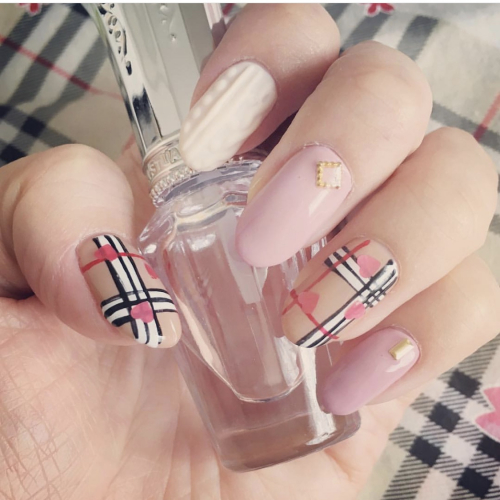 秋と言えばチェックもいうことで、バーバーリーチェックのジェルネイルをした時に撮影した写真になります 背景にもチェックのハンカチで統一感を持たせてみました