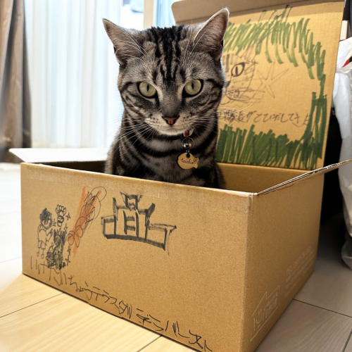 段ボールに勇んで入ってみたものの、何でかわからんがお気に召さない