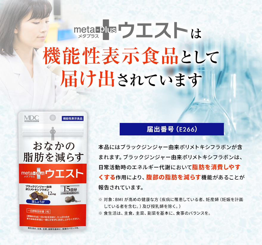 #メタプラス #メタプラスウエスト #おなかの脂肪を減らすウエスト #機能性表示食品 #ブラックジンジャー #ポリメトキシフラボン #L-カルニチン #メタボリック