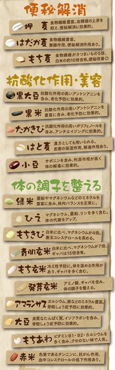 押麦、発芽玄米、アマランサス、黒大豆、はだか麦、青肌玄米、もち麦、もち玄米、黒米、緑米、赤米、もちきび、もちあわ、ひえ、はと麦、たかきび、小豆、大豆(全て国産)