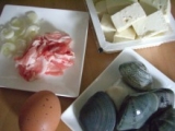 1.鍋に豆腐、豚肉、あさり、万能の素、水を入れ軽くまぜる。