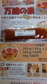 こんにちは。I LOVE SEOUL一押し商品【ハンおばさんの手作り調味料”万能の素”!】を沢山の方に知っていただくために、今回イベントに参加いたしました。 ★商品説明★ 本場韓国のスン豆腐チゲを簡単に、ご家庭で楽しんでもらいたい。。。食べた方に幸せになってもらいたい。。。 そんな願いを込めて作った【ハンおばさんの手作り調味料”万能の素”】一人分~大人数分まで簡単に作れます。 その他の韓国料理:キムチチゲ、ユッケジャン、カルビタン、キムチチャーハン、キムチ餃子etc… これひとつで旨味、コク、味付け問題なし!だから”万能の素”なのです。 また、保存料、防腐剤は一切使用しておりませんが粉末にすることにより冷凍保存で3ヶ月品質保証!商標特許獲得商品(商願2008-100568)当店の自信作です!! 皆様の参加お待ちしております。 |