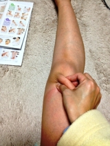 2.腕が肩と直角になるようにまっすぐ上げ、手首から肩に向かって少しずつずらしながら数カ所押します。