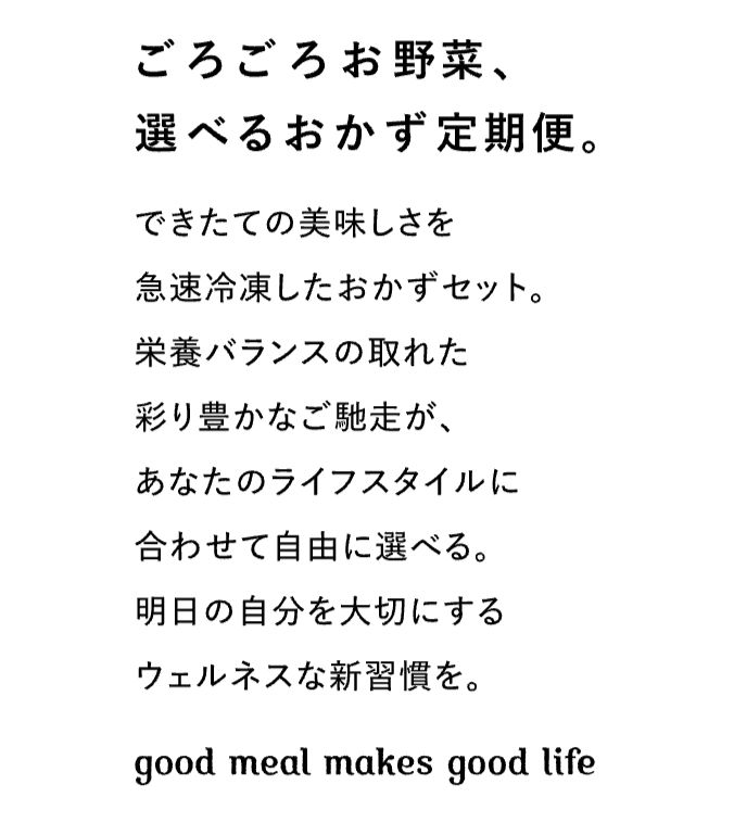 健康的な毎日のための冷凍惣菜お届けサービス。料理にかかる手間から解放されたゆとり時間でそれぞれのライフスタイルをより豊かなものに。明日の自分を大切にするウェルネスな新習慣を。