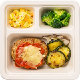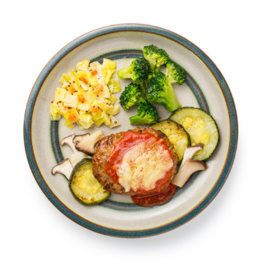 ①濃厚トマトソースとチーズの贅沢ハンバーグ