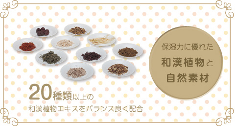 20種類以上の和漢植物エキス配合のみやびこころには、肌本来のちから素肌力と、和漢のちからの保湿力、こだわりの自然素材、原料は食べ物と同じように、安全性を大切にして選んでいます。