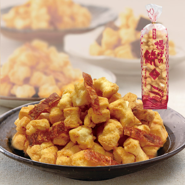 厳選されたもち米にえびを練り込み、生地の風味を生かすためバランスのとれた魚介の旨みで味付けした『揚げの餅 えび』