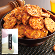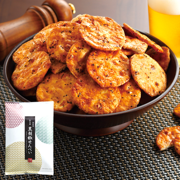 丁寧に焼き上げたうす焼きせんべいに、薫り高い黒胡椒をたっぷりと振りかけた、ピリッとした辛みと豊かな香りが、クセになるおいしさの「黒胡椒せんべい」をお楽しみください。