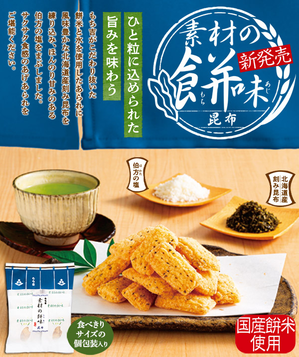 北海道産刻み昆布を練り込み、伯方の塩をまぶしたあげあられ。