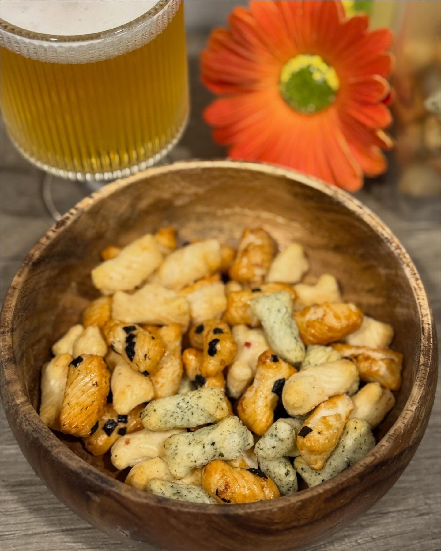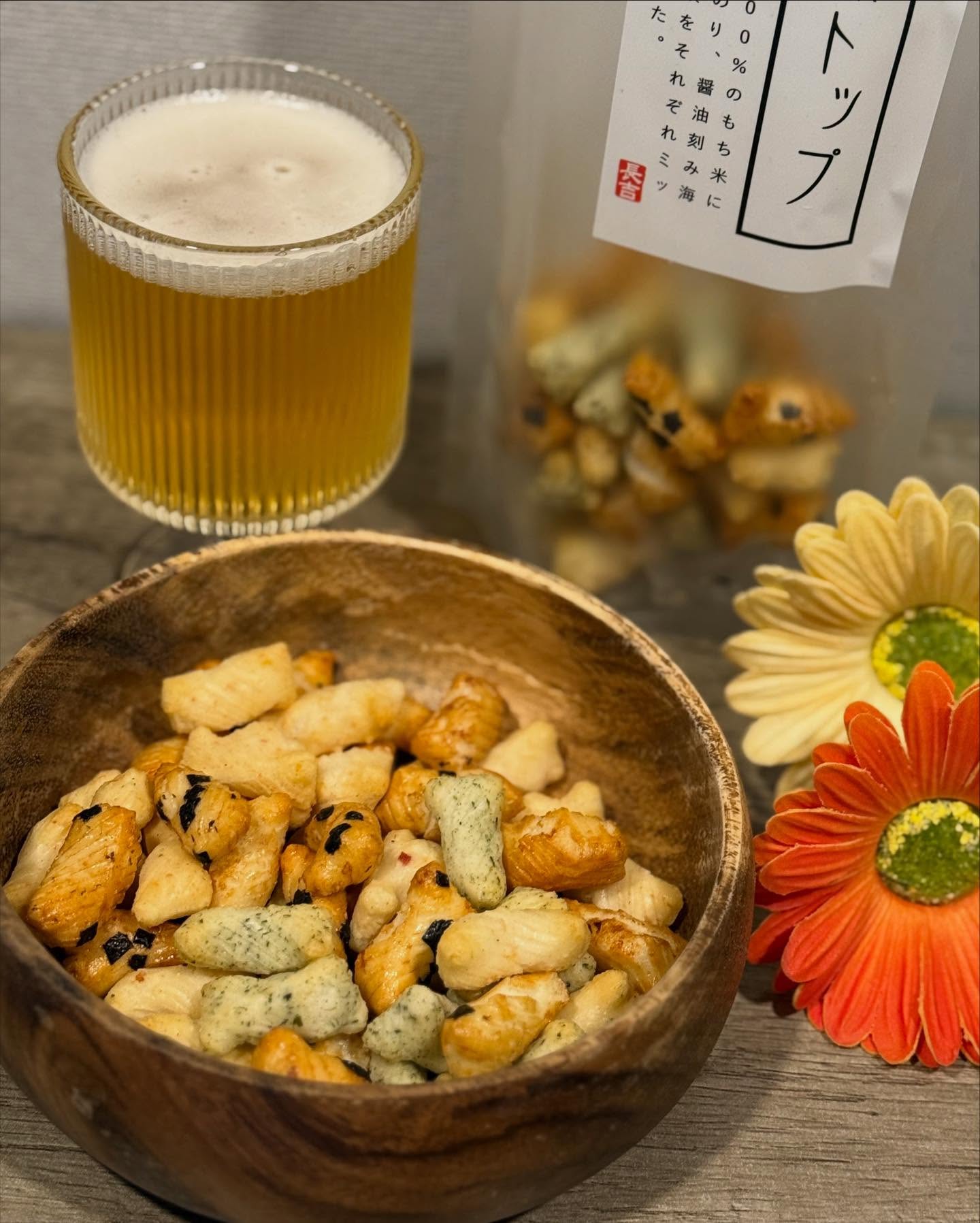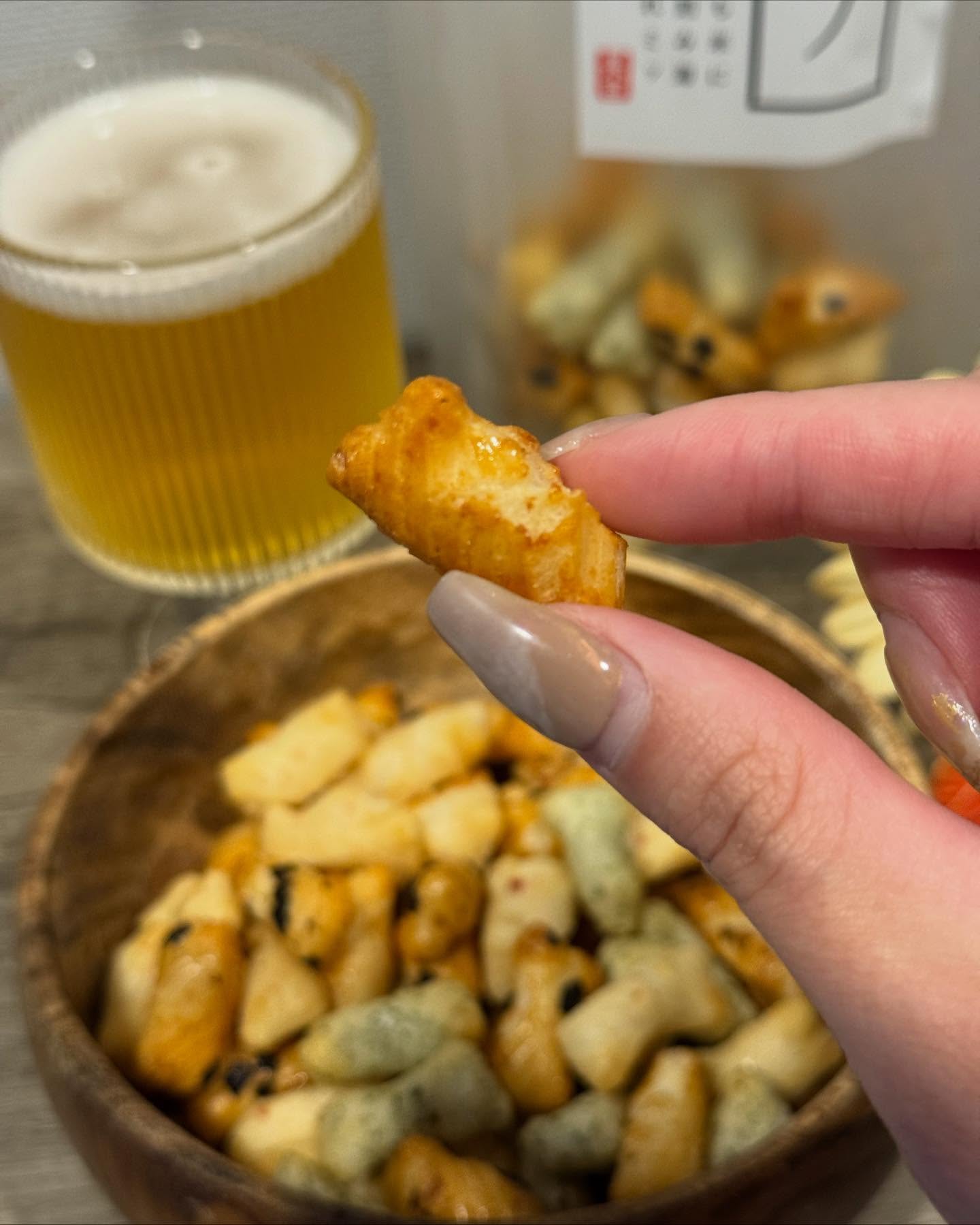「えび味」、「青のり味」、「醤油刻み海苔味」のあられが入っており、1袋で3種類の味を楽しめちゃうの😚🎶