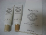 モエモエスペシャルケアセットを試してみました これは2ステップで使うヘアトリートメントですね シャンプー後水気を切った髪にまず1から塗って続いて2を塗るといった感じです 香りは共にジャスミンの香りでいい匂いです テクスチャは1の方がやわらかめで2が固めでした 使用感はそんな… 2012/06/28