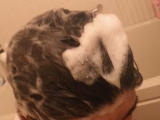 <step1>髪を濡らした後、モンゴ流シャンプーEXを適量を手に取り、指の腹で頭皮をマッサージをしながら洗います。