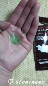 <step1>髪を濡らした後、モンゴ流シャンプーEXを適量を手に取り、指の腹で頭皮をマッサージをしながら洗います。