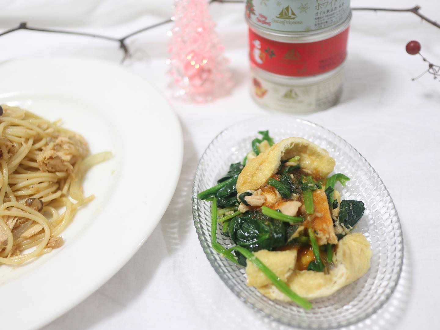 にんにく入りツナ缶でほうれん草と油揚げ炒めを作りました。