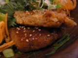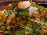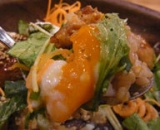 蓮根をつかったつくね、水菜、九条ネギを使い、甘辛いみたらし味の和風どんぶり。「タヒチアンノニ リーフティ」で炊き上げた玄米と「タヒチアンノニ ジュース」を飲んで育った鶏が産んだ卵を使用。