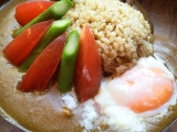 旬のアスパラとトマトを使い、豆乳でマイルドに仕上げたカレー。隠し味にタヒチアンノニ ジュースを使い、「タヒチアンノニ リーフティ」で炊き上げた玄米と「タヒチアンノニ ジュース」を飲んで育った鶏が産んだ卵を使用。
