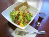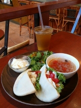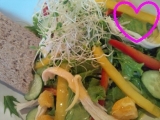 特徴 : 自家製のオレンジ&ジンジャードレッシングをかけたグリーンカール、水菜、スプラウト、オレンジ果実、トマト、チキンなどを使用したサラダに、「スライブ マキシドイド」(30ml)をセットにした抗糖化に効く素材をたっぷり使ったメニュー。