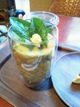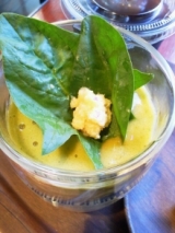 特徴 : ほうれん草、アガベシロップ、おろし生姜など「抗糖化」によい食材と、ノニ、サンシュユ、セイヨウサンシュユ、オリーブ葉エキス、ブルーベリー、クランベリーなどのイリドイド含有植物を使用した健康補助飲料「スライブ マキシドイド」をミックスしたグリーンスムージー。