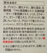 水、グリセリン、酸化チタン、酸化亜鉛、乳酸桿菌/ワサビ根発酵エキス、乳酸桿菌/オリーブ葉発酵エキス、シリカ、カラギーナン、オリーブ葉エキス、グリチルリチン酸2K、トレハロース、アロエベラエキス-1、カミツレエキス