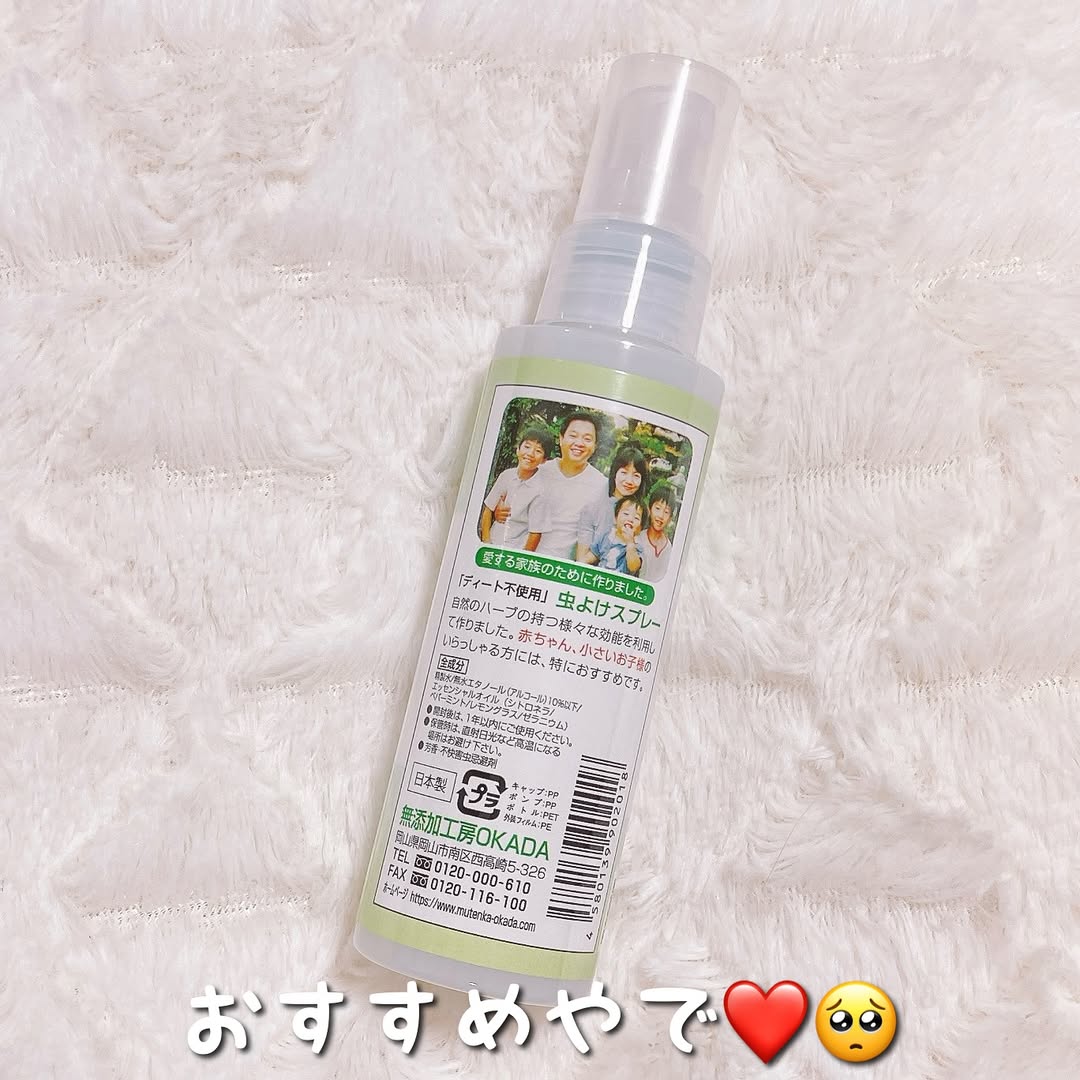 ♡ 今回ご紹介させていただくのは 無添加工房OKADA様の 安全安心 無添加虫よけスプレー . 市販の虫よけスプレーには、 危険な薬品「ディート」が 含まれているそう🥹 無添加工房OKADAの 「安全安心 無添加虫よけスプレー」 はディートを完全無添加で、 天然のハーブの香りで害虫を ブロックします🙆♀️✨ . ハーブのいい香りで シュッとスプレーするだけなので 使いやすい🎶🥰 . #PR #無添加工房OKADA #虫除け #虫よけ #虫除けスプレー #虫よけスプレー #無添加工房 #無添加工房OKADA #敏感肌 #アトピー #赤ちゃん #ベビー #岡田クレンジング #岡田石けん #岡田ローション #岡田美容オイル #岡田美容クリーム #岡田UVミルク #ハーブ #無添加 #オーガニック #無添加虫除け #無添加虫除けスプレー #赤ちゃん用虫除け #無添加虫よけ #無添加虫よけスプレー #幼児 #外遊び #monipla #mutenka_fan