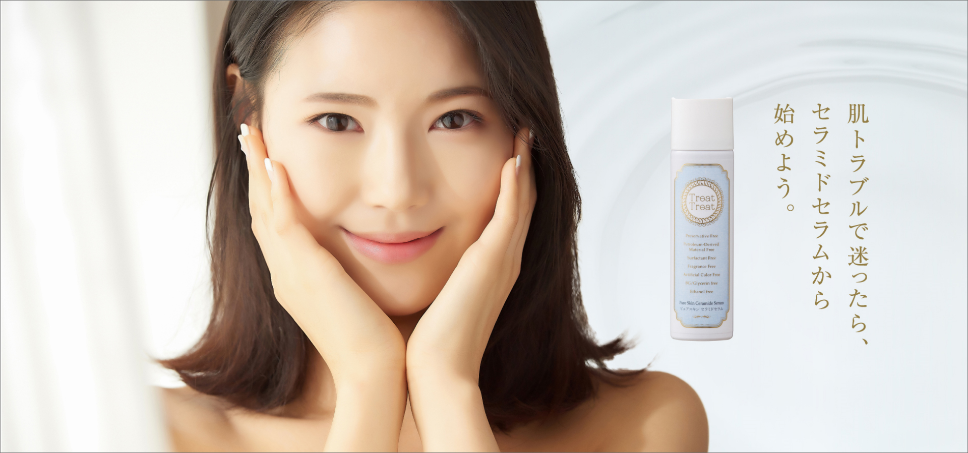 防腐剤不使用、ご使用中も空気や雑菌の混入を許さない炭酸ガスエアゾールボトル採用。Treat Treatが独自に実現した完全無添加美容液です。