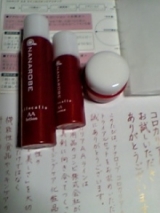 先日届いたナナローブさんのコロカリアAAトライアルセットを使ってみました まずは化粧水「整えて深く導く化粧水 コロカリアAAローション」という名前です 水のようにサラサラした感じです 使い方に書いてあるように、コットンを使って、なじませました… 2011/04/02