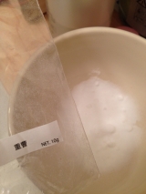 自然化粧品研究所から、「炭酸ジェルパックキット」をお試しさせて頂きました 「炭酸ジェルパックキット」は、重曹(10g)、キサンタンガム(03g)、グリセリン(11g)、複製水(防腐剤、フェノキシエタノール入り(4g)、クエン酸(4g)1回分入っています①容器に、白い重曹、少し黄色いキサンタ… 2013/11/02