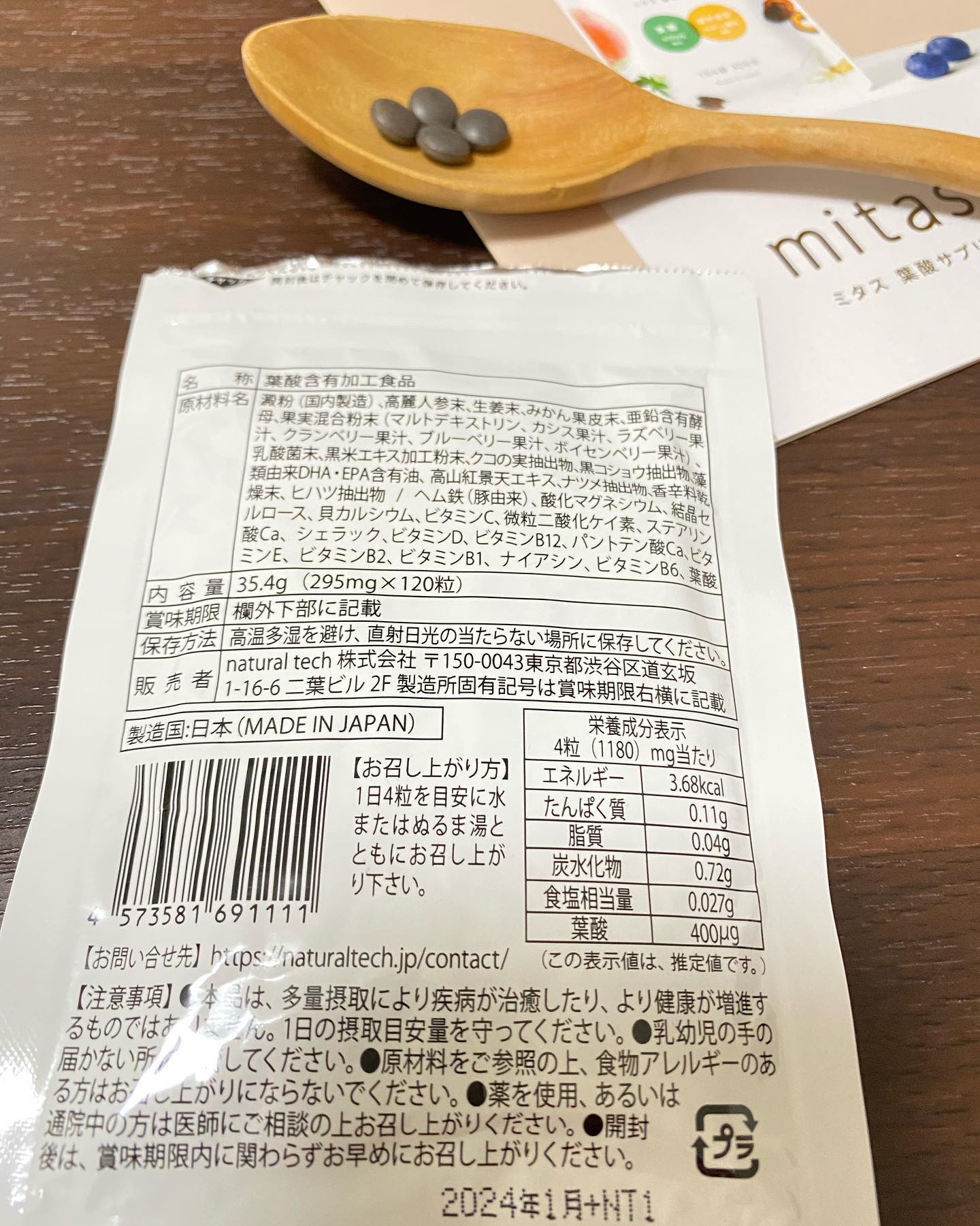 ♡ u0040mitas.series ミタス 1日4錠 30日分 ずっと気になっていた、葉酸サプリ🌿 妊活期に必要な葉酸𝟦𝟢𝟢μ𝗀、鉄分𝟧𝗆𝗀のほか、各種ビタミンやミネラルなどの栄養素をしっかり配合しています🕊🤍 葉酸を手軽に摂取し、 温活も同時にできるお助けアイテム👍 身体を温める効果がある 和漢素材もたくさん入ってるので、 退社が悪くあまり汗がかけず 温活したい私にはピッタリのオールインワンサプリ✨ 他にも鉄や亜鉛にマグネシウム カルシウムやビタミンなど 妊娠中のプレママさんが積極的に摂りたい 成分も配合されてます☺️ わたしも温活で代謝良くして この夏を健康的に乗り切りたいな🏋️♂️ #mitas #ミタス葉酸 #葉酸サプリ #妊活期 #葉酸 #温活 #monipla #naturaltech_fan #PR #naturaltech株式会社 #mitas #ミタス葉酸 #葉酸サプリ #妊活期 #葉酸 #温活 #monipla #naturaltech_fan