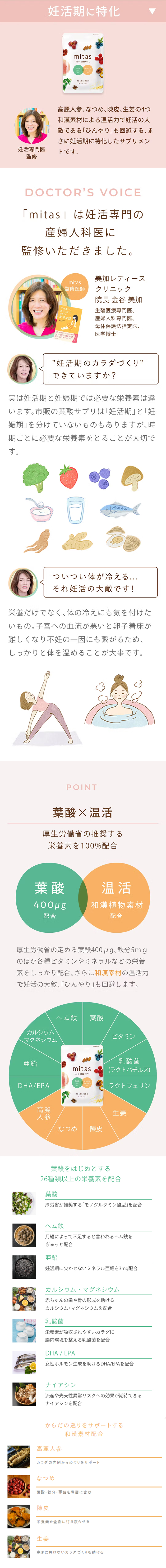 妊活期に適した栄養素でお悩みをサポートする「mitas(ミタス)」は厚生労働省の定める葉酸400μg、鉄分5mgのほか各種ビタミンやミネラルなどの栄養素をしっかり配合。さらに和漢素材の温活力で妊活の大敵であるひんやりもケアします。