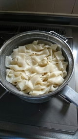 ひもかわうどんは、茹でると約23㎜の巾広うどんです。風味豊かな上州の味、つるつるもちもちの歯ごたえはひもかわうどんならではのものです。
