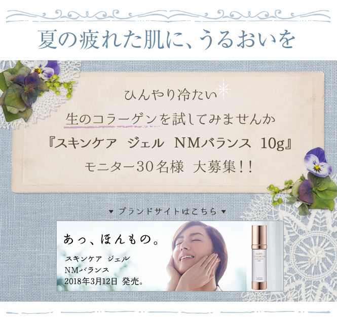 このたびはニッピコラーゲン化粧品のモニター企画をご覧いただきまして、誠にありがとうございます。