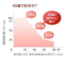 ところが、このコラーゲンは25歳を境に減少してしまい、なんと40代では約半分、60代では約3分の1まで減少。