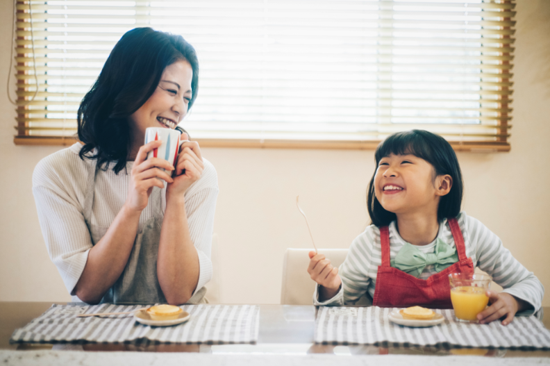 ①親子でコラーゲン100を持ちカメラ目線で笑っている写真