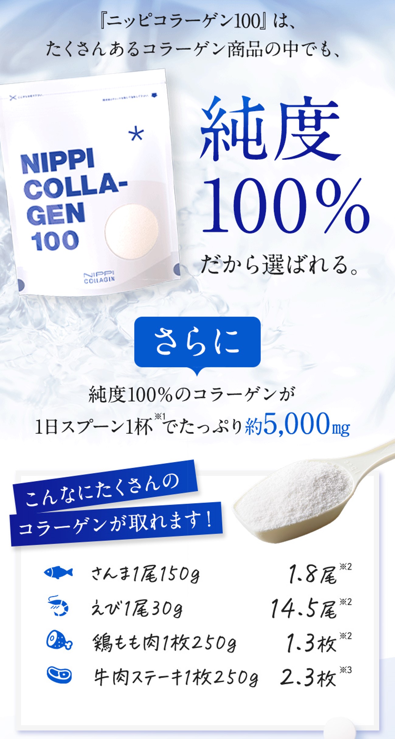 ”無味無臭””低分子コラーゲン100%”の食べるコラーゲンといえばコチラ! 体内に吸収されやすい低分子コラーゲン100%の粉末 「ニッピコラーゲン100」はサッと溶けやすい粉末タイプに仕上げたコラーゲン。 お料理にお飲み物にとアイディアひとつで使い方が広がります。 ハンバーグやカレー、煮物、お味噌汁に混ぜれば、毎回の食事でコラーゲンを摂ることもできますし、 コーヒー、ミルク、ジュースなどに入れてお好きなときに手軽に飲むのもおすすめです。 レビュー数 : 58 |