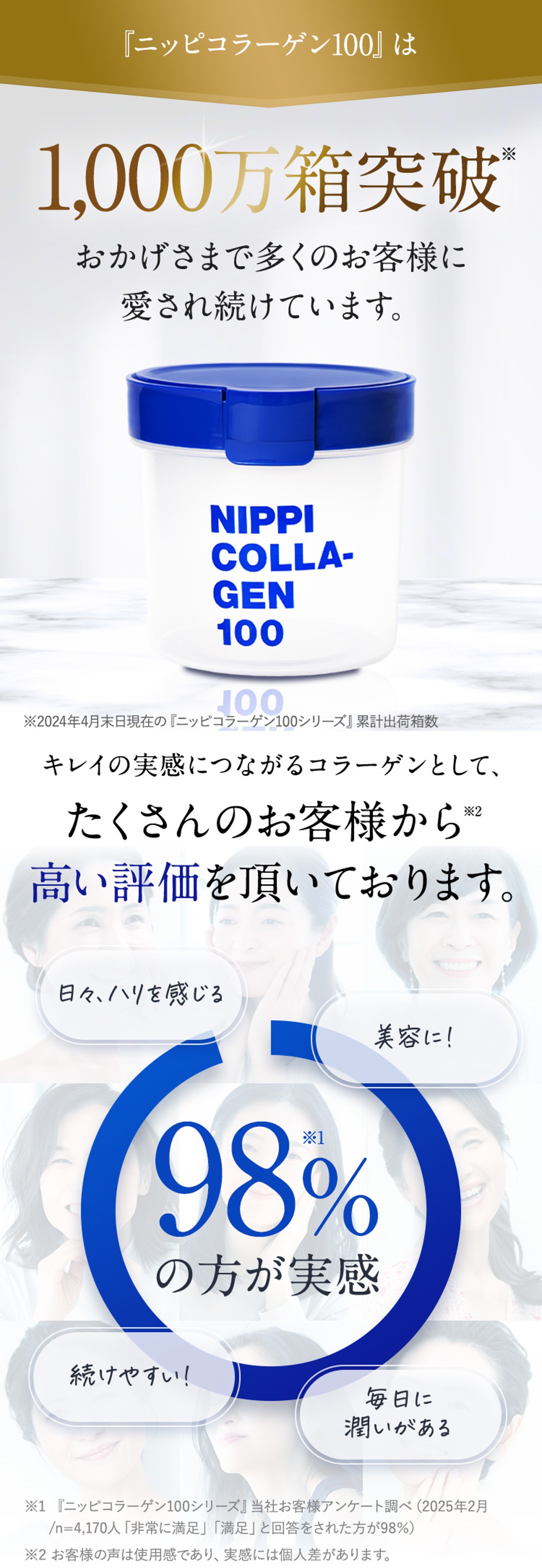 ※「ニッピコラーゲン100シリーズ」当社お客様アンケート調べ(2025年2月/n=4,170人「非常に満足」「満足」と回答をされた方が98%)