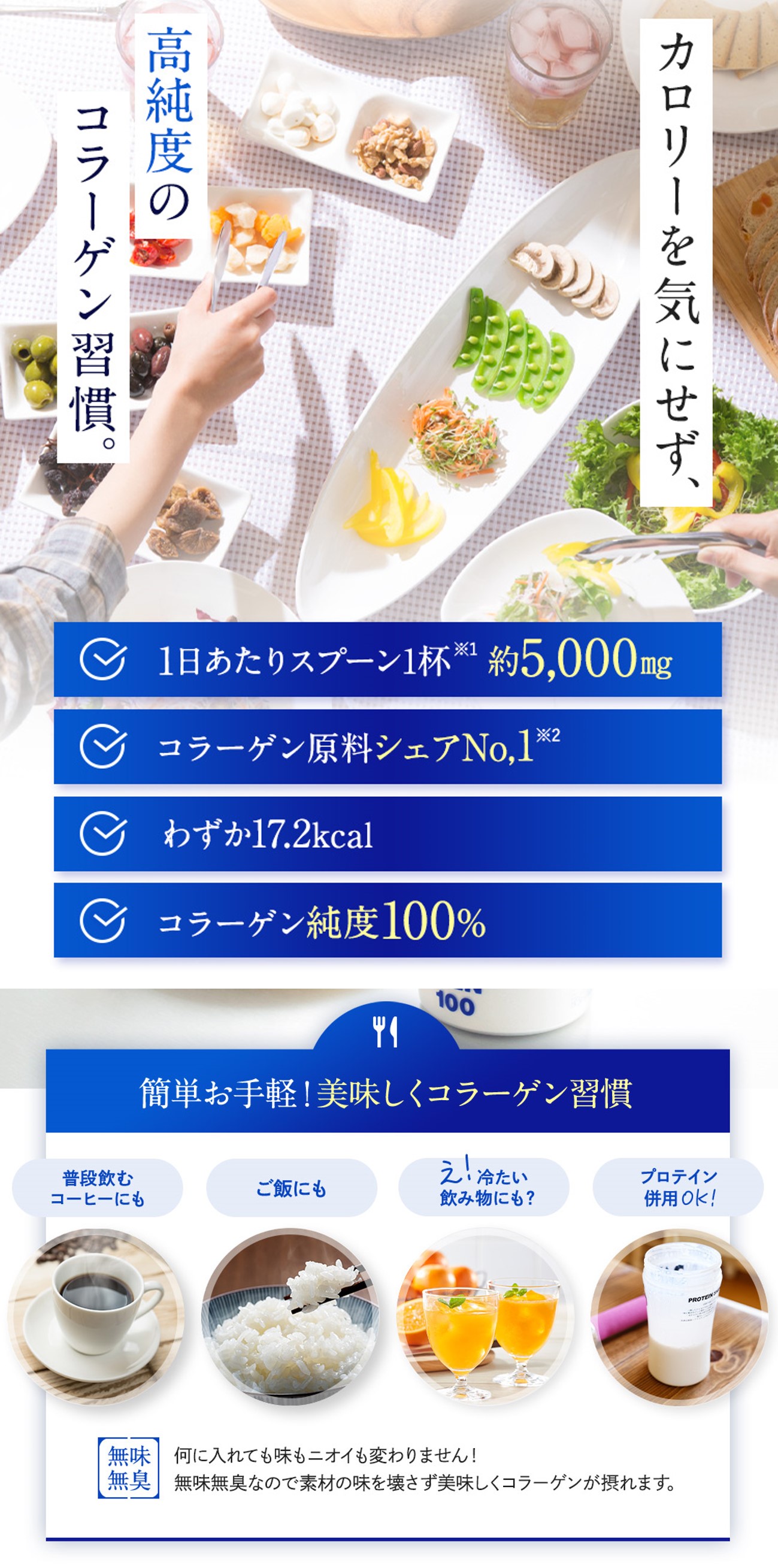 56年の研究成果が凝縮している純度100%のコラーゲンです。さらに、体内に吸収されやすい低分子コラーゲンで、スプーン約1杯で5000mgのコラーゲペプチドが摂れます!