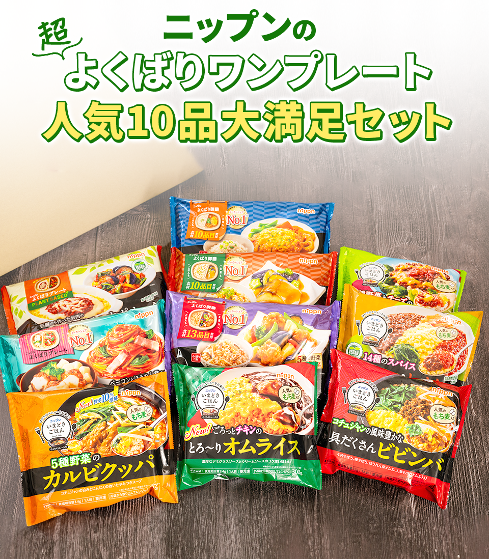 レンジで5~7分チンすれば、簡単に熱々のワンプレートが完成!紙トレー入りだから片付けの手間なし。ニップンの大好評冷凍プレート商品を10品詰め合わせたセットです。メニューの種類も豊富で飽きずに楽しめます。セット特別価格15%OFF。