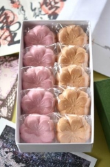 今回の「さくら最中」は国産の青えんどう豆のうぐいす餡と伊豆大島産の桜葉を使用した桜餡の2種類の味が楽しめます。