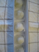 日本きらりファンサイト参加中日曜日のおやつは、、、山梨県産の注目の新品種「シャインマスカット」が丸ごと一粒入った「フルーツ大福【雪みどり】5個入」 でしたなんともキレイなグリーンのボックスに入ってました中には、ひとつずつ丁寧にパックに入れられたフルーツ大福が5つ♪大福のてっぺんには、なんと金箔… 2013/11/12