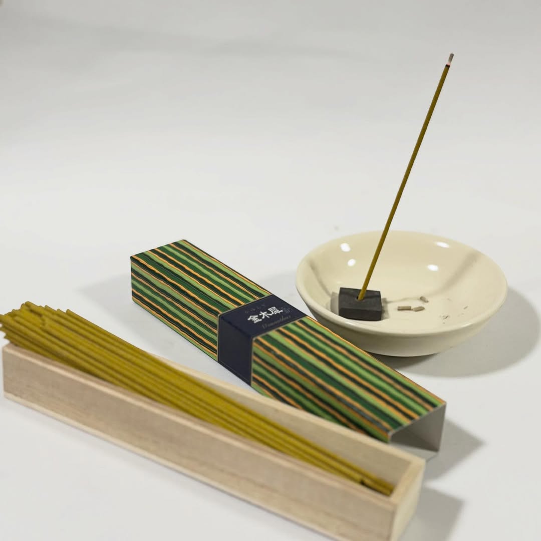 中にはお香スティックが40本と、シンプルなお香立てが同封されています。使用時は、お香立ては陶器の小皿などにのせて、灰受けとして安心かと思います。