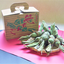新潟名物・笹だんごです。佐渡産のコシヒカリ粉と、佐渡で摘んだヨモギ(一部新潟県産使用)で作った風味豊かな生地で特製の粒あんを包み、笹の葉で丁寧に包んで蒸しあげました。