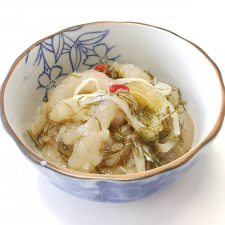 「甘えび松前漬」です。昆布といかの旨味たっぷりの松前漬に、プリっとした食感とほのかな甘みが特徴の甘えびを加えました。さらに数の子も加えることによって食感をアップさせています。全体的に味わい深く仕上がりました。ご飯のお供に、酒の肴にと重宝する一品です。