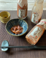 「イカのうに塩辛」3本セットです。イカの肝は使わず、生臭さを抑え、ちょっぴり辛めの昔ながらの塩辛です。プレーンの塩辛にうにペーストを混ぜました。うにの旨味と酒粕の芳醇な香り、甘みが感じられる味わいに仕上げています。