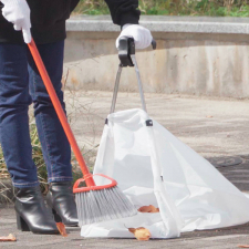 袋取り付け型ちりとり 「ふくろうちりとり」です。ゴミ袋をちりとりに変身させる、現場や家庭でも便利なアイデアツールです。お庭の掃除に、企業や地域の清掃活動に、仕事現場の後片付けにお使いいただけます。市販の45Lのゴミ袋をセットするだけで、ちりとりに変身。ゴミがたまれば、袋を閉じてそのままゴミ出し完了です。コンパクトに折りたたみできるので、収納場所にも困りません。フレームは丈夫でさびにくいステンレススチール製です。