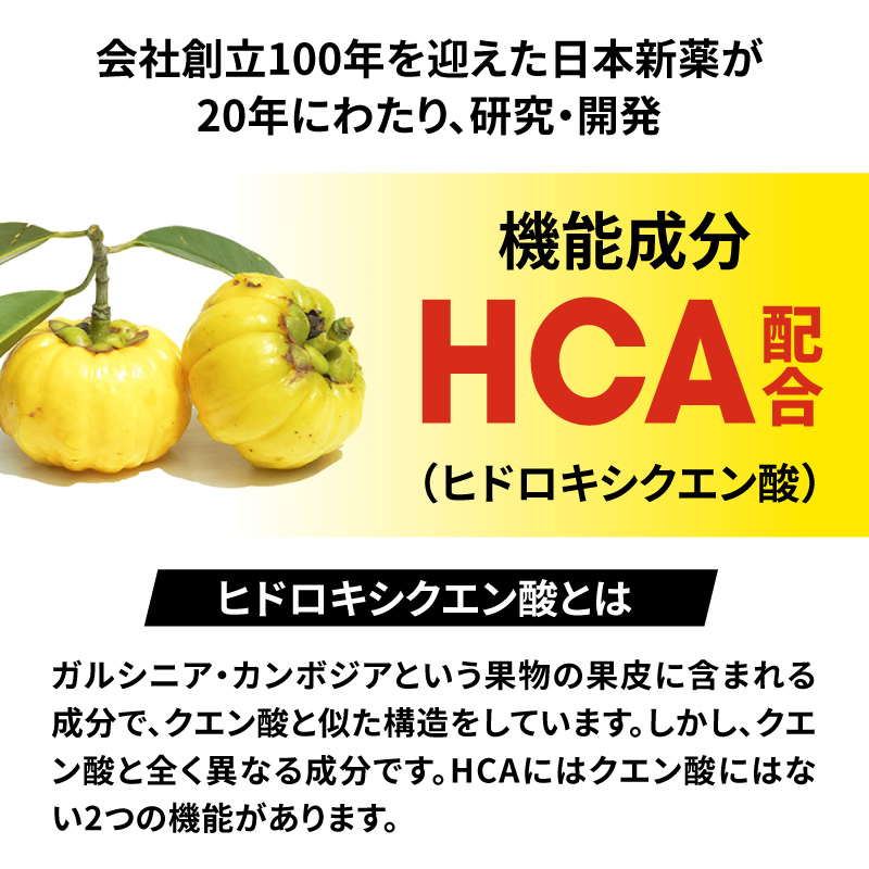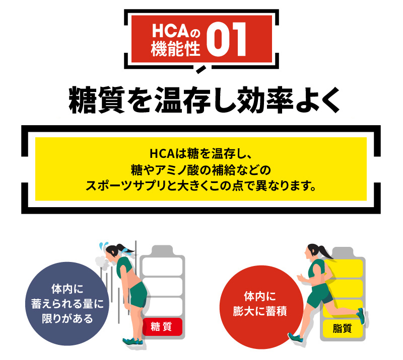 「HCA(ヒドロキシクエン酸)」はプロから初心者まですべてのアスリートが抱える「後半のスタミナ切れ」の悩みを解消すべく日本新薬が長きにわたり研究を重ねてきたこだわりの成分です。