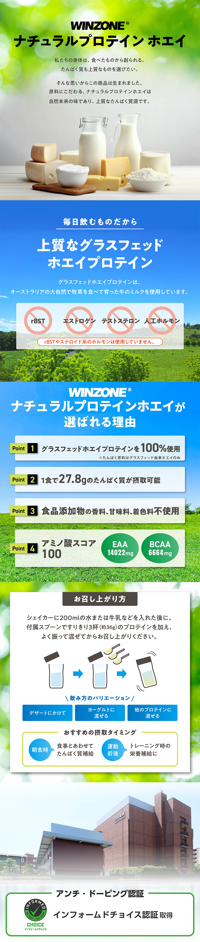 WINZONE ナチュラルプロテインホエイ プレーン味 1袋(1kg) 牧草のみを食べて自由に育った乳牛の牛乳からつくったホエイ、 通称「グラスフェッド」ホエイを使用したホエイプロテイン。 余計なものは一切入れず、自然派で上質なたんぱく質だけを摂取したい方向け。 レビュー数 : 29 |