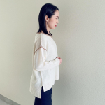 キーネックデザインで顔まわりをすっきり、ドロップショルダーで気になる肩のラインもさりげなくカバー。