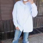 オーバーサイズ仕様ながら、スタンドカラーとストライプ柄で大人っぽくキマる長袖シャツ。