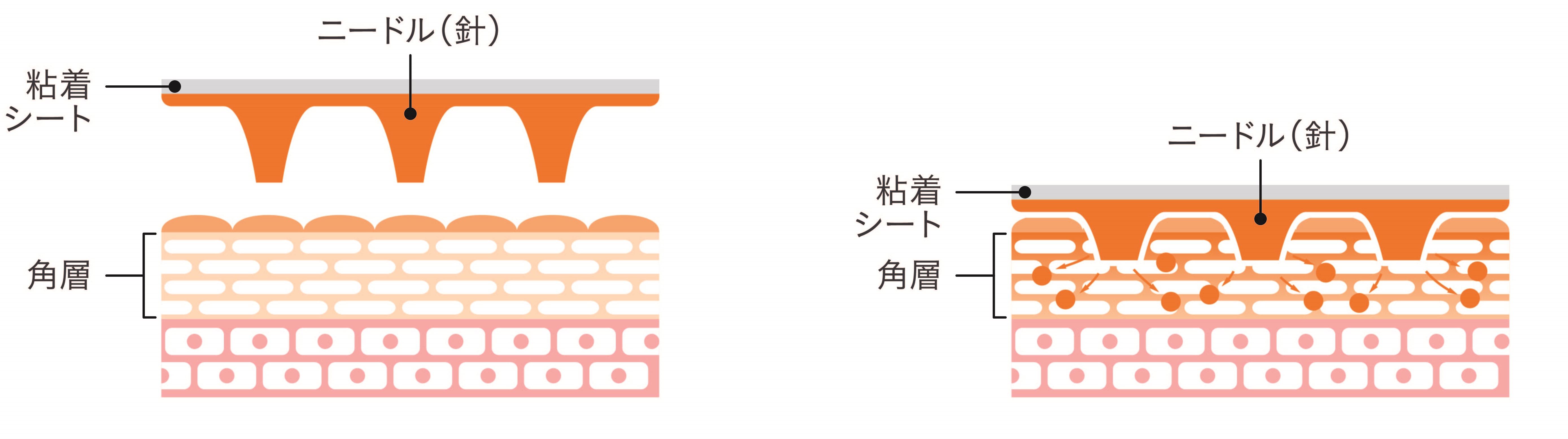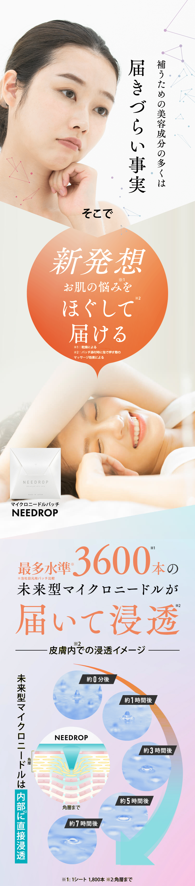 ヒアルロン酸と美容成分でできた3600本(1シート1800本)の針が、角層最深部まで到達!角層のすみずみまで美容成分を浸透させてくれます。