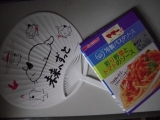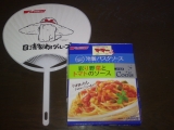 冷製パスタソースと当社のキャラクターコニャラのうちわのセットです。